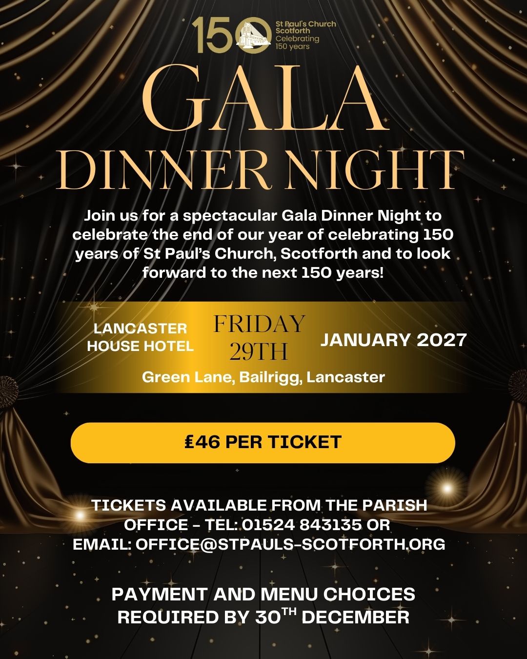 The big finale!  Join us for a spectacular Gala Dinner Night to celebrate the end of our year of celebrating 150 years of St Paul’s Church, Scotforth and to look forward to the next 150 years.